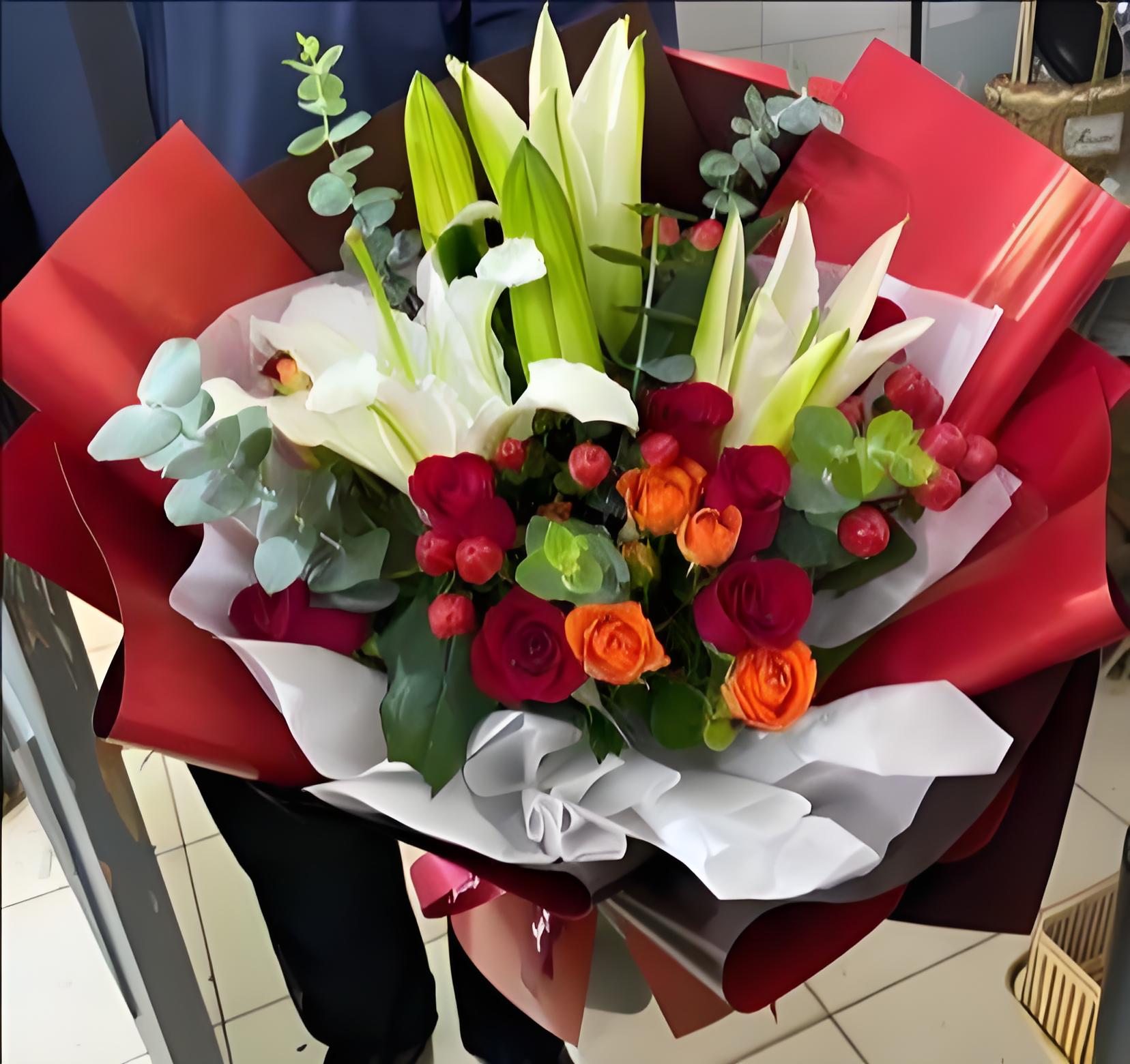 兴安盟阿尔山市花店包11枝红玫瑰、2枝多头白百合、6枝橙色多头玫瑰、红豆、尤加利叶